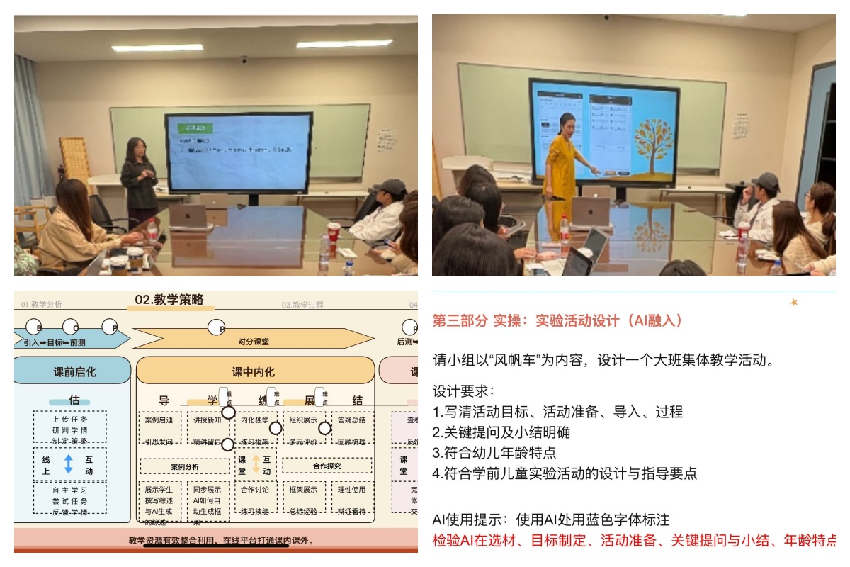 与会教师按专业领域分为理论课程、教法课程、技能课程、双语课程及信息课程五个小组,共同探讨人工智能与教育教学的深度融合。在分享环节中,徐伟霖老师以《论文写作》课程为例,展示了如何通过对比AI与人工撰写的文献综述,引导学生批判性思考,并学会甄别与优化AI生成内容。滕芸老师在《学前科学教育》课程中,鼓励学生利用AI辅助设计儿童实验方案,同时着重培养学生对AI输出内容在目标设置、关键提问等方面的专业检验能力。罗晨琳老师分享了在《幼儿园课程》设计中的经验,通过任务拆解与要求提交AI生成内容与修改版本的对比,有效避免学生依赖AI,并强化了其专业判断力。张蓓蓓老师则探讨了AI在《即兴弹唱》这类高实操性课程中的应用边界与可能,指出AI虽无法替代基础技能训练,但可与节奏训练等专用软件结合,进行针对性辅助教学。