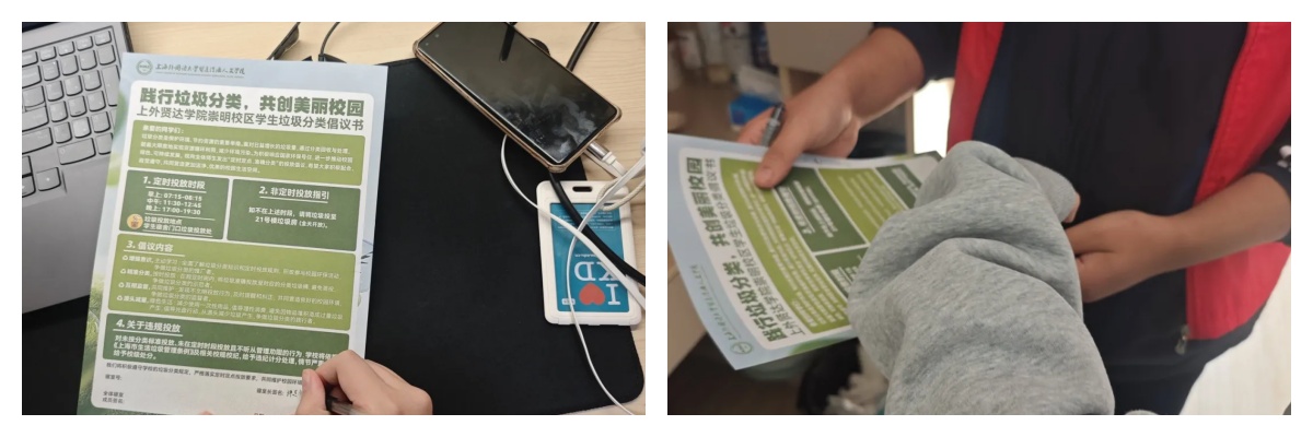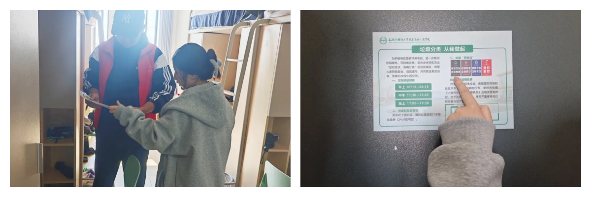 10月28日,崇明校区辅导员例行查寝时为同学们带来了学校的“绿色礼物”——垃圾分类倡议书及垃圾分类警示磁贴。辅导员老师逐一为同学们发放倡议书,号召大家积极响应、主动践行垃圾分类。同时,指导同学们将警示磁贴张贴于寝室门后,作为日常垃圾分类的提示,强化分类意识。