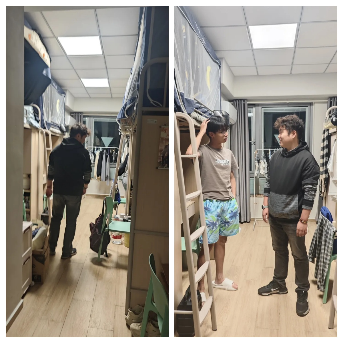10月20日,钱书记与23级辅导员走进学生寝室,与同学们进行亲切交流,详细了解大家的学习、生活状况,认真检查寝室卫生状况、用电安全以及基础设施使用情况。针对寝室文化建设,书记和辅导员结合实际情况提出了切实可行的建议,勉励同学们携手打造温馨、和谐、积极向上的寝室氛围。