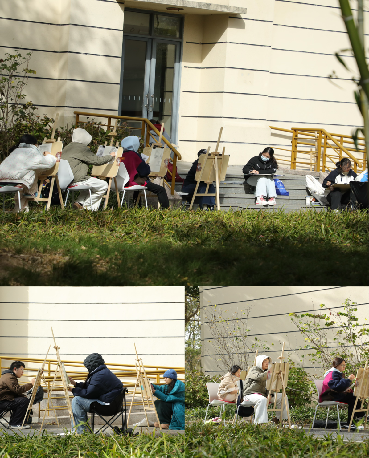 基于此,制定了详尽的《实践教学周活动方案》,明确了各阶段任务、指导教师职责、安全预案及成果考核标准。活动覆盖了图书馆、教学建筑群、中心湖畔、体育场及林荫大道等几余个具有形式美感与人文底蕴的写生点,为学生提供了多元的创作视角。